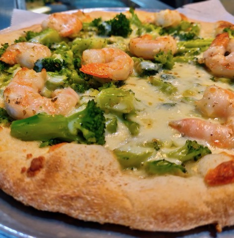 Delicious grilled shrimp and broccoli on a white pizza, high in protein and low in carbs for a satisfying meal.